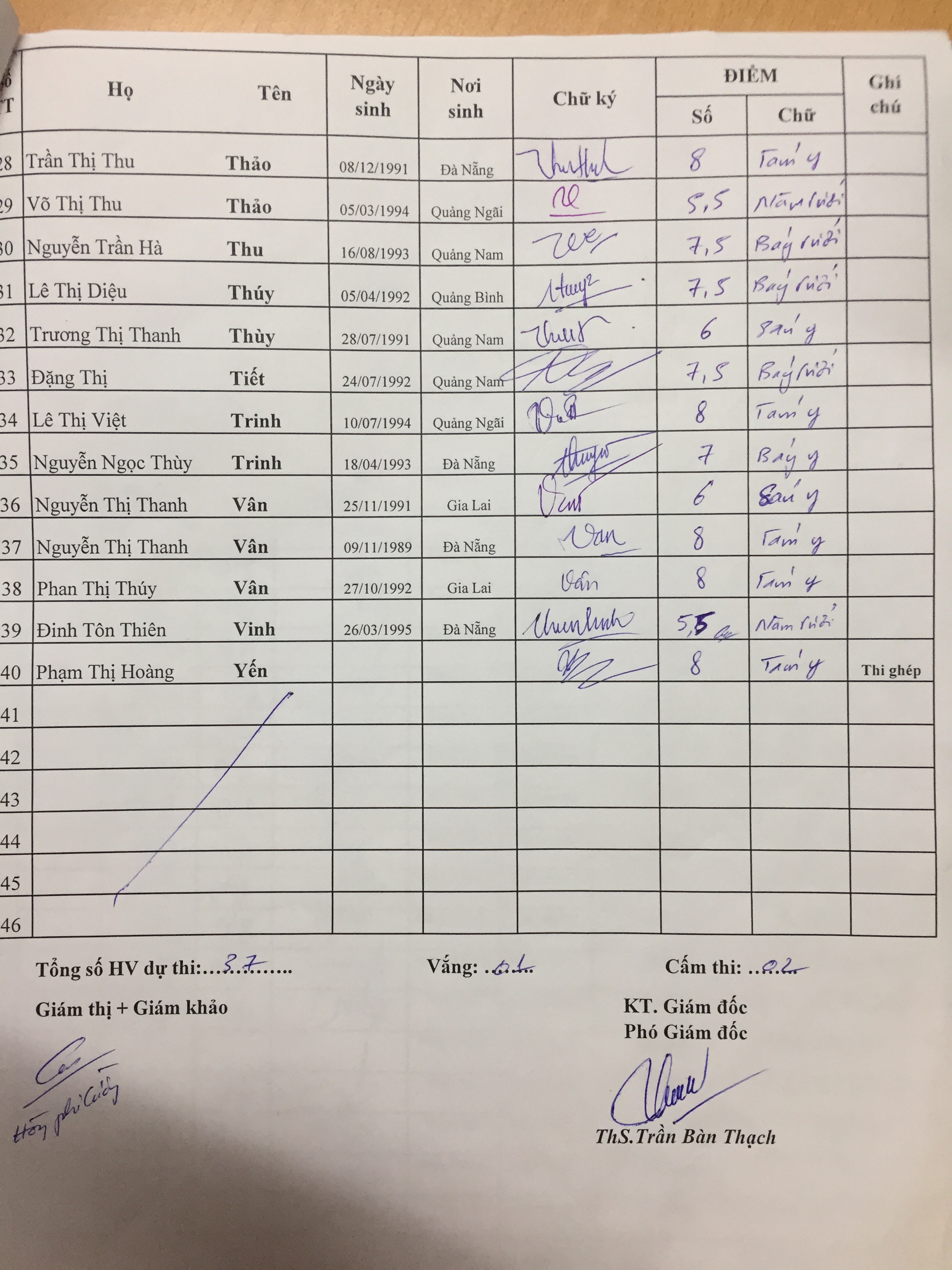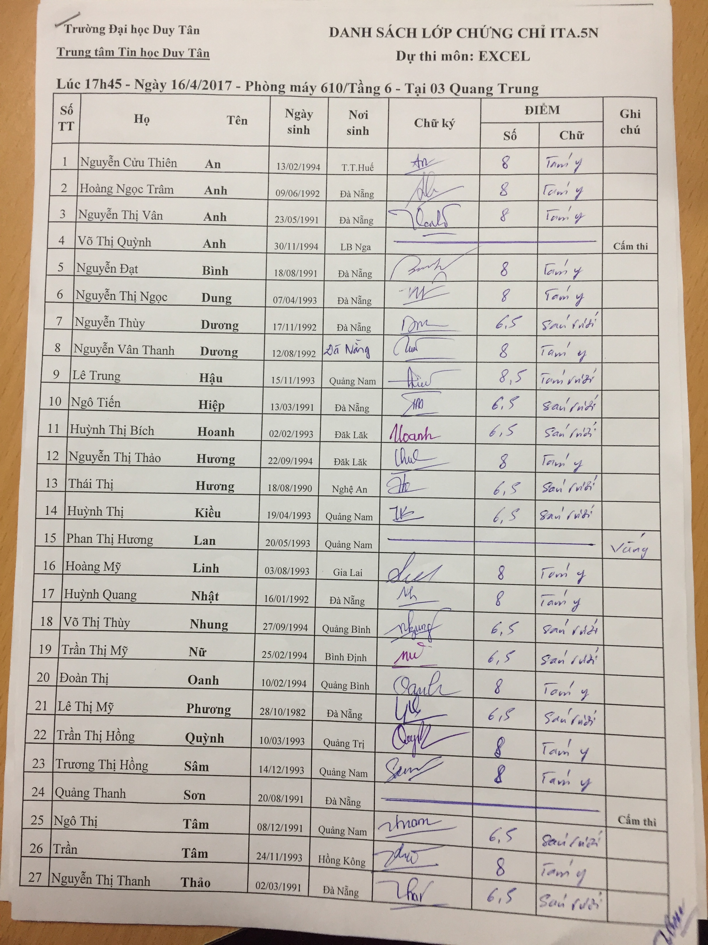 Điểm thi hết môn Excel lớp ITA.5N (21/04/2017)