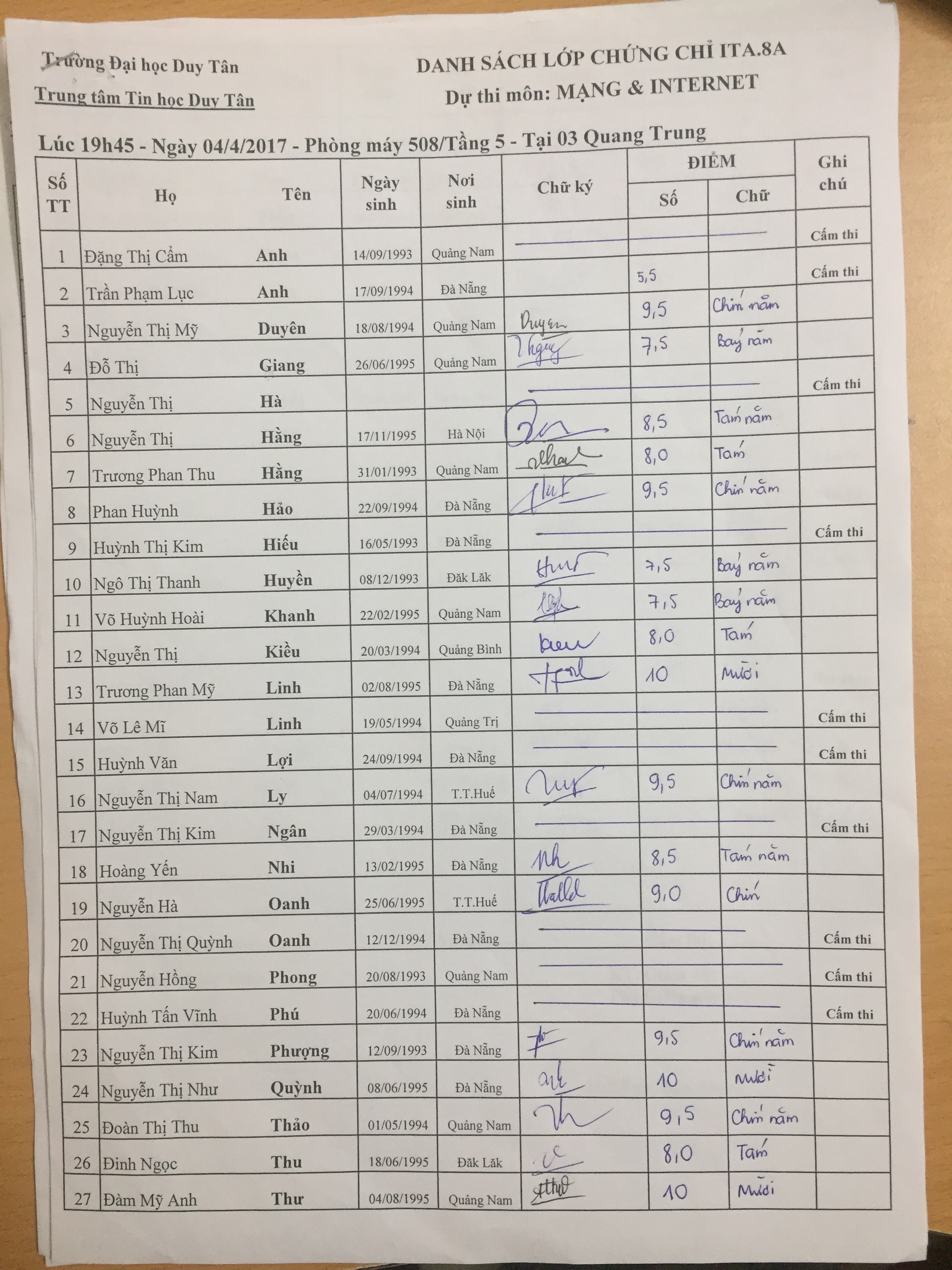 Điểm thi hết môn Lan/Internet lớp ITA.8A (11/04/2017)