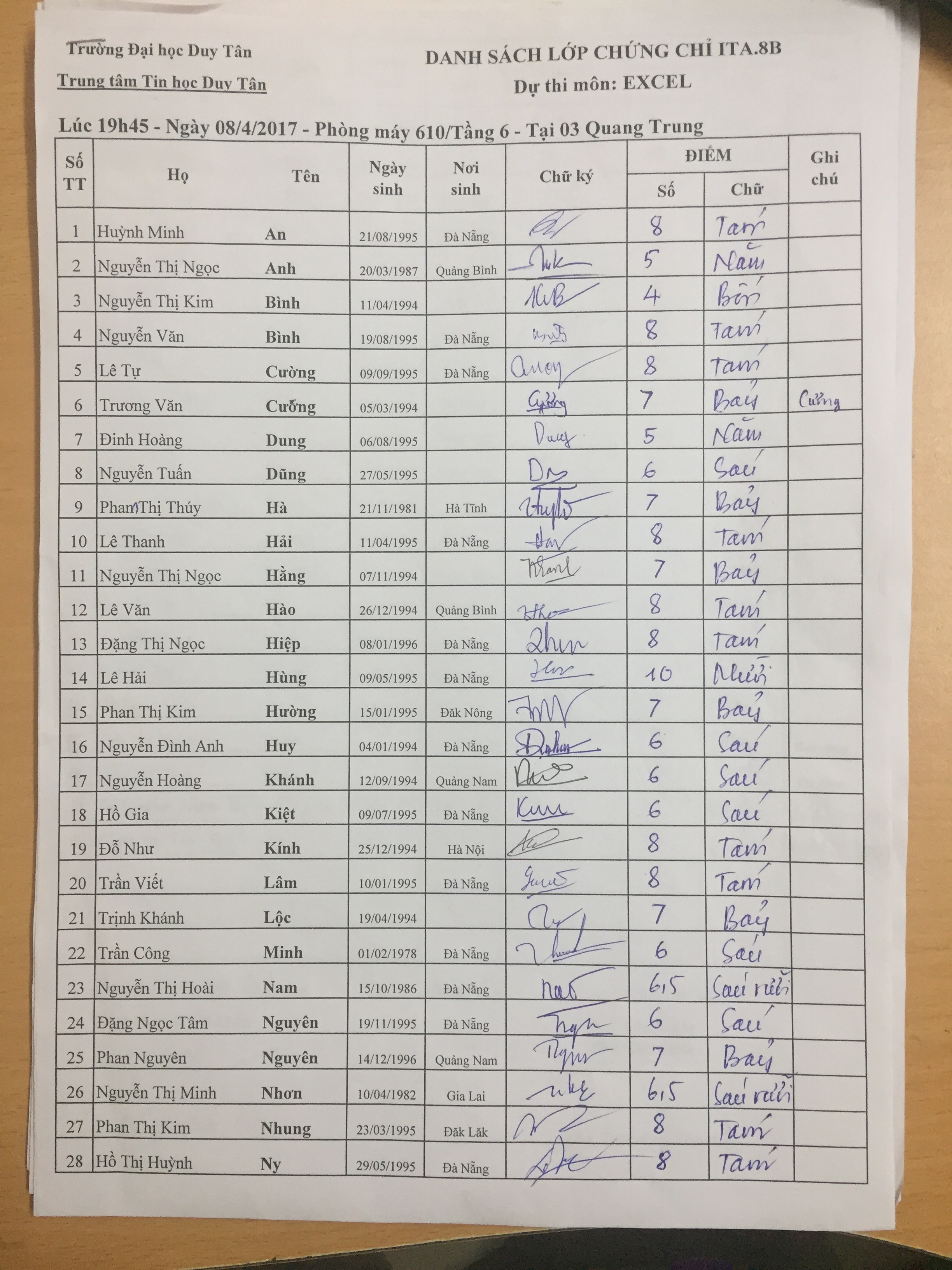 Điểm thi hết môn MS Excel lớp ITA.8B (11/04/2017)