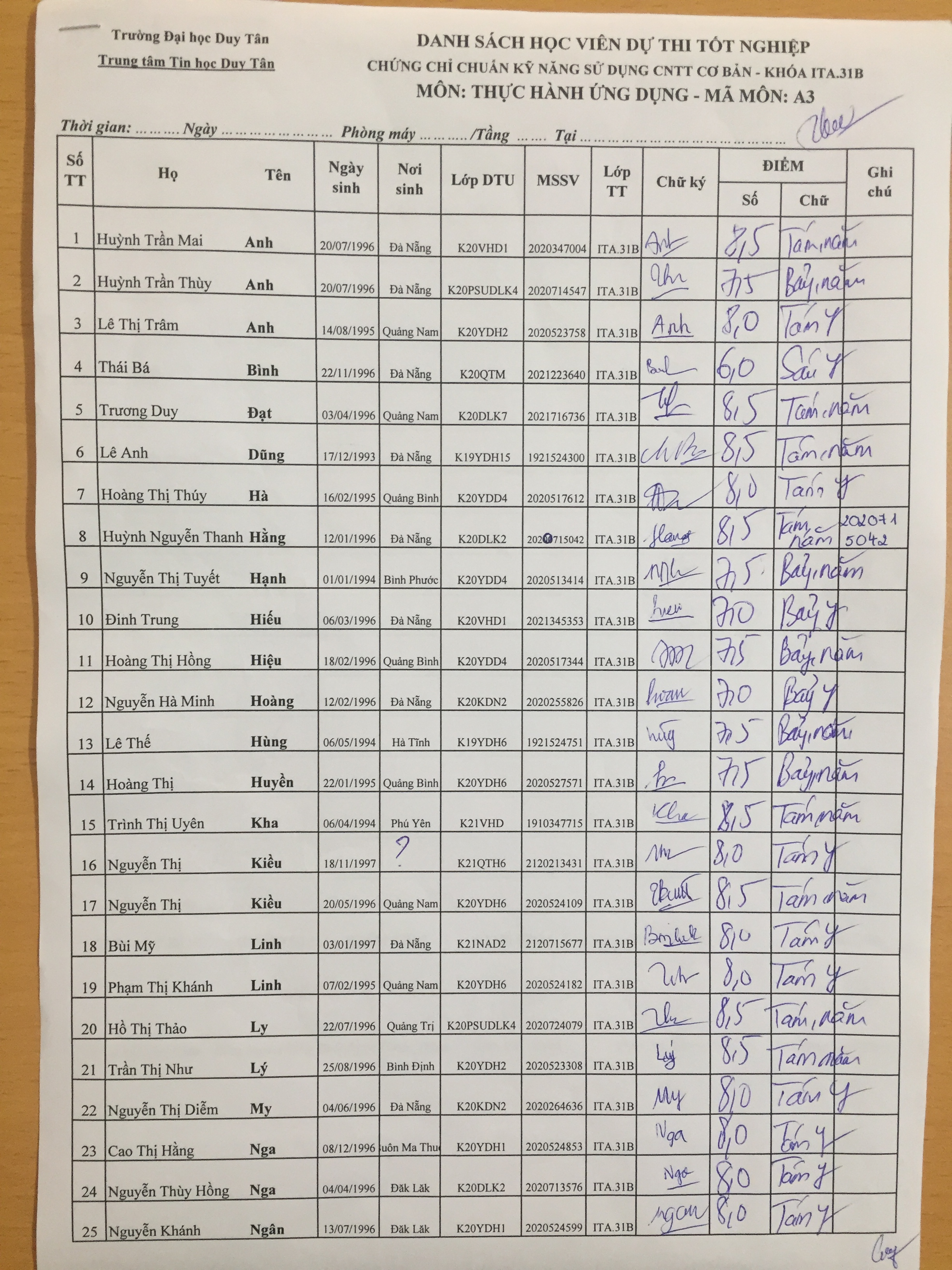 Điểm sát hạch Chứng chỉ Ứng dụng CNTT Nâng cao suất 15h00 ngày 25/01/2026