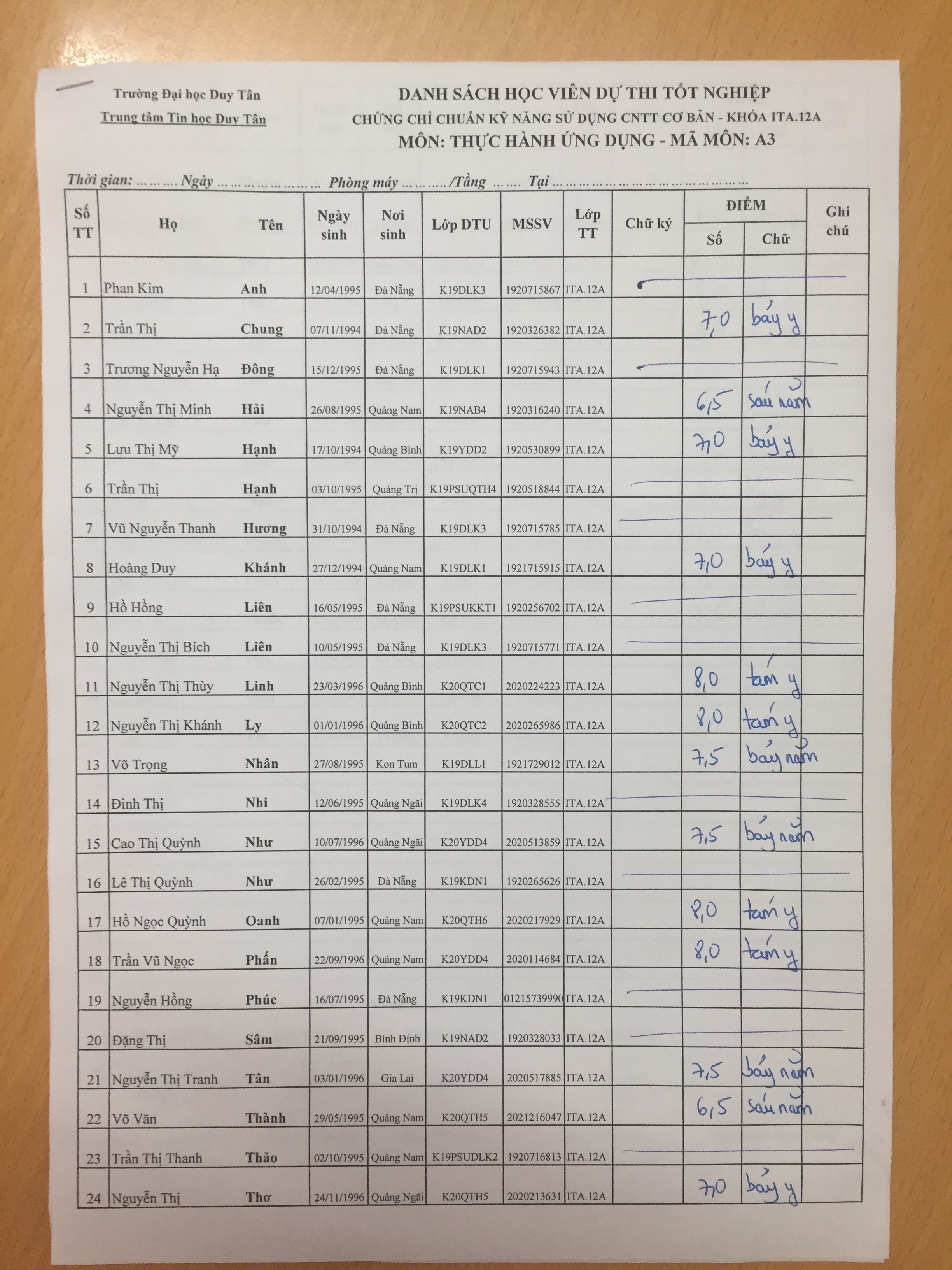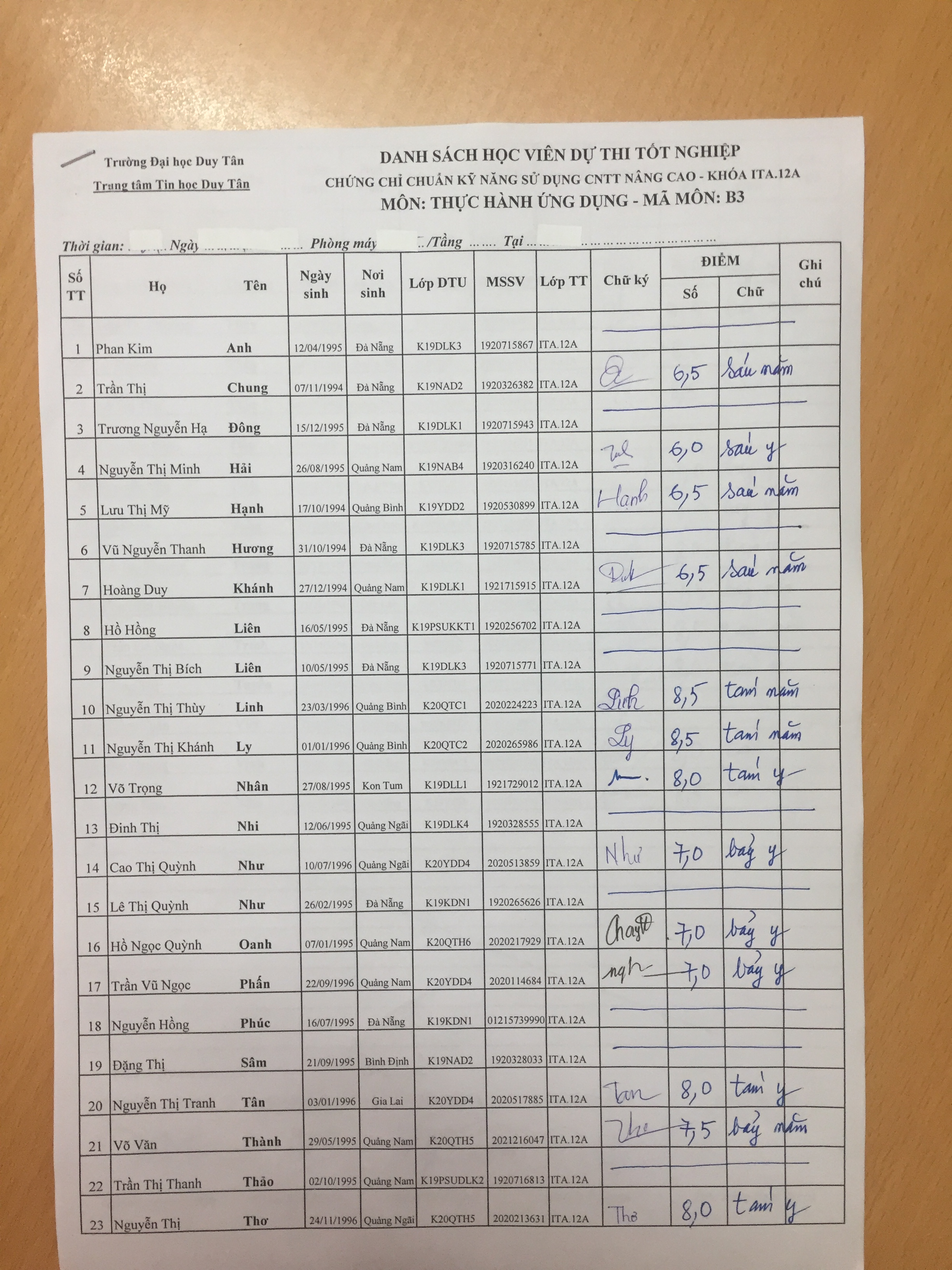 Điểm sát hạch Chứng chỉ Ứng dụng CNTT Nâng cao suất 15h00 ngày 25/01/2026
