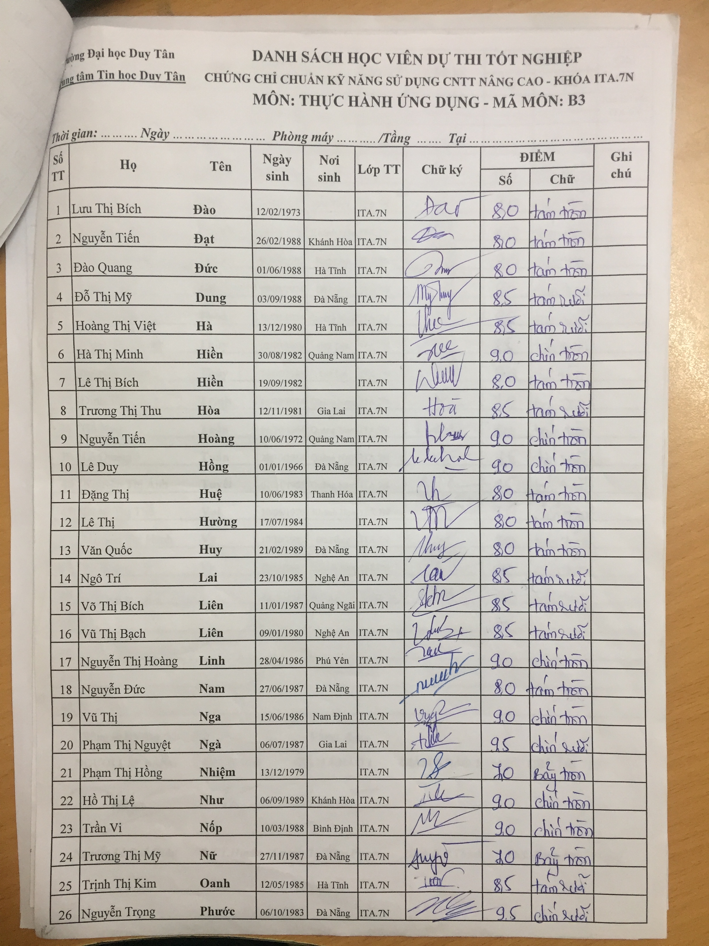 Điểm sát hạch Chứng chỉ Ứng dụng CNTT Nâng cao suất 15h00 ngày 25/01/2026